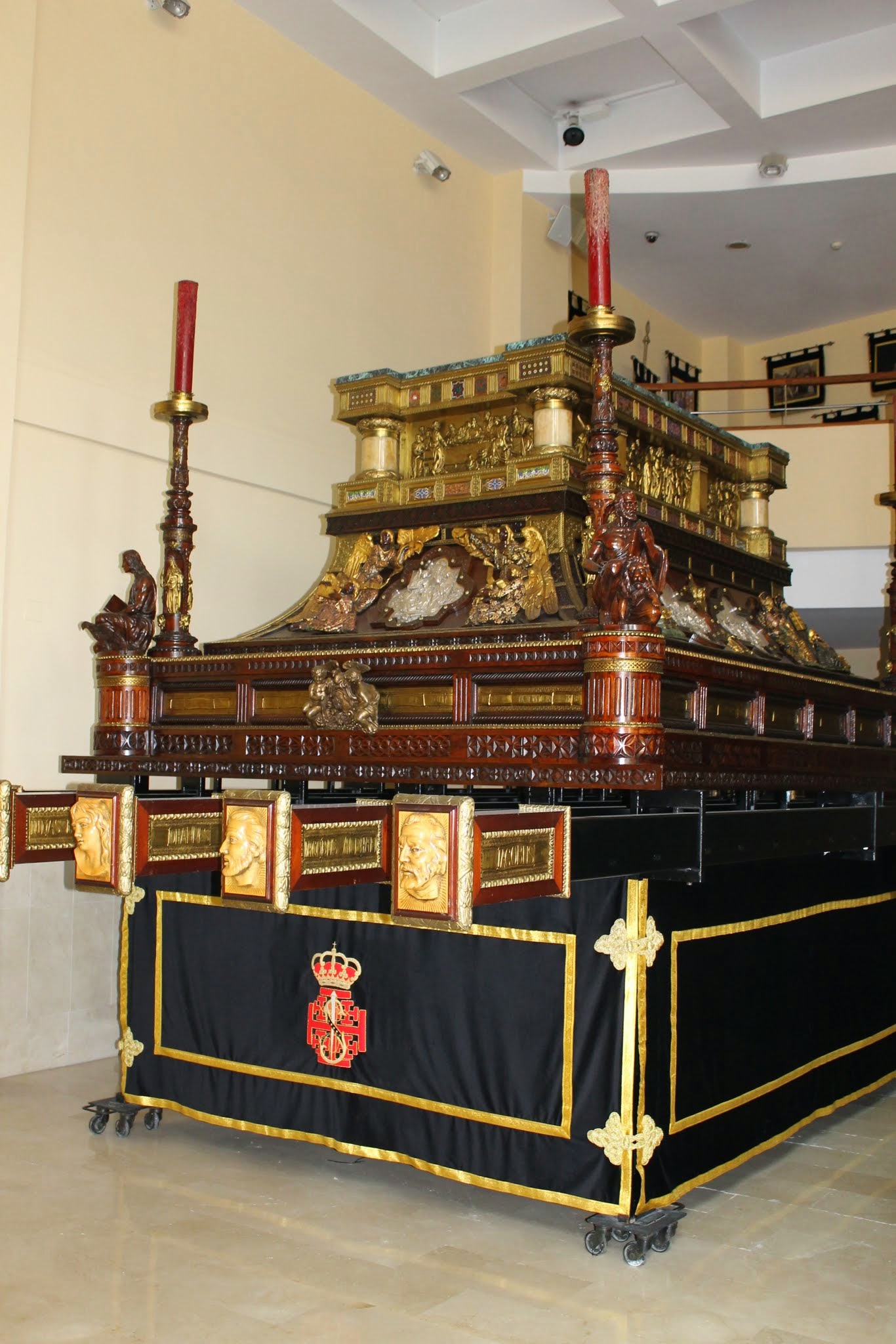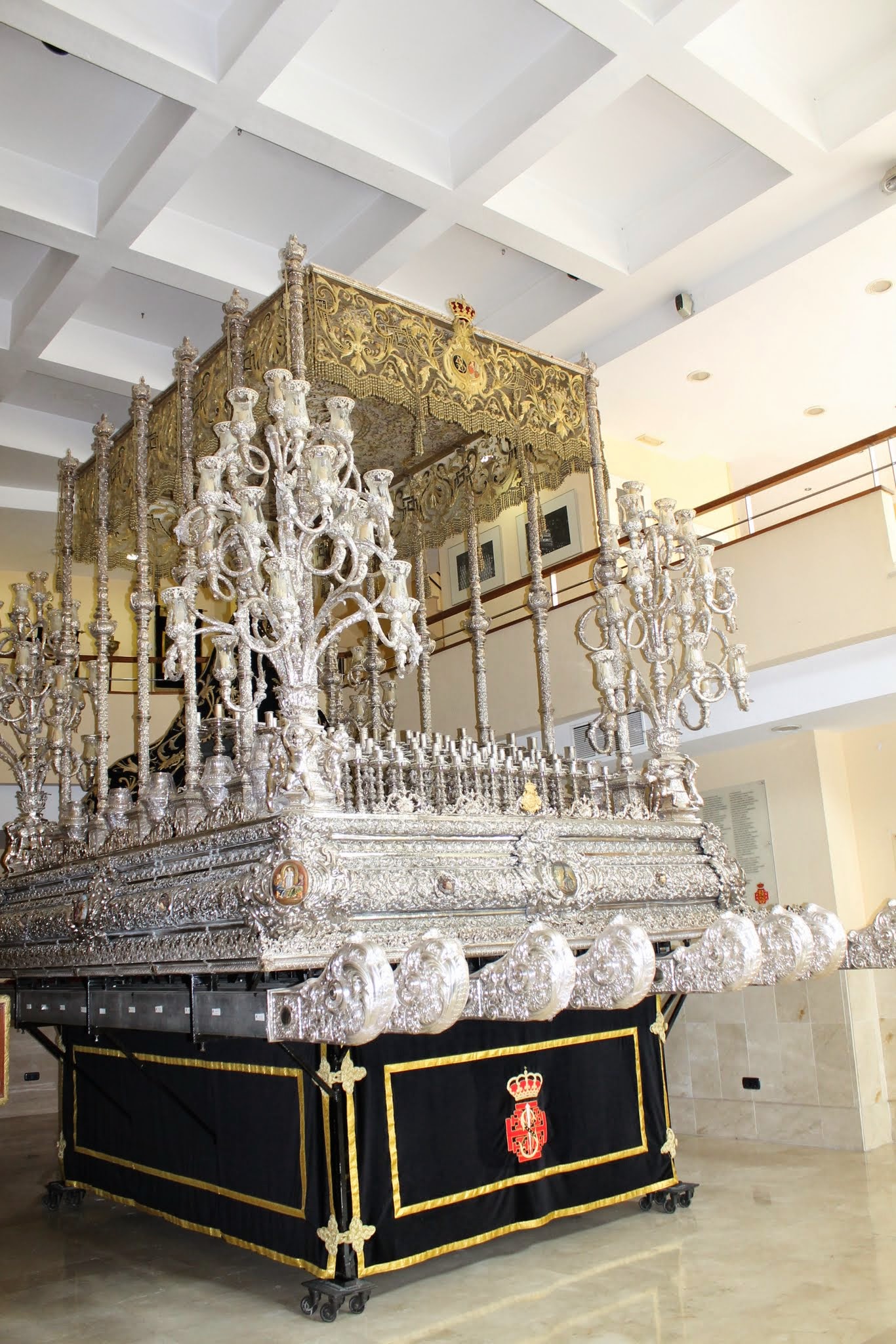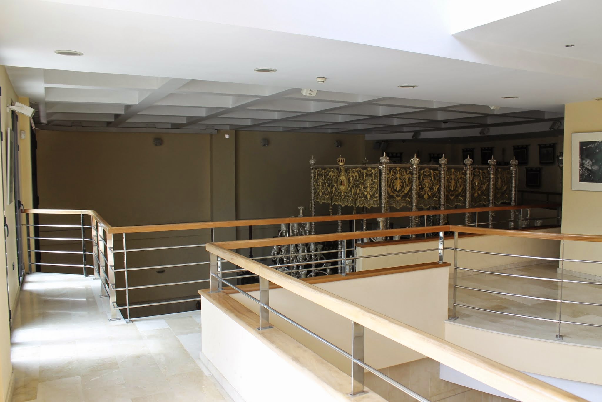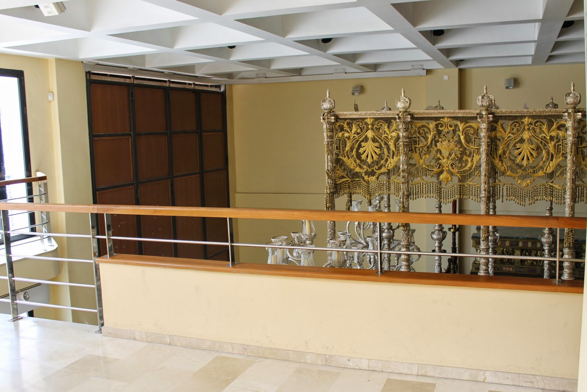 Una vez que se ha accedido al vestíbulo de la planta baja del edificio, nos encontramos a la izquierda del mismo, el salón de tronos, donde están dispuestos los majestuosos tronos tanto del Cristo, obra del padre Félix Granda, como el de la Virgen, obra de Seco Velasco.