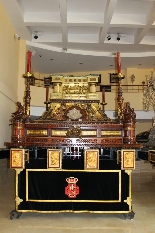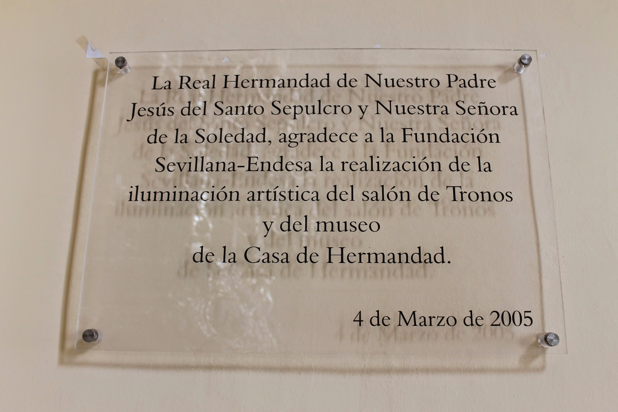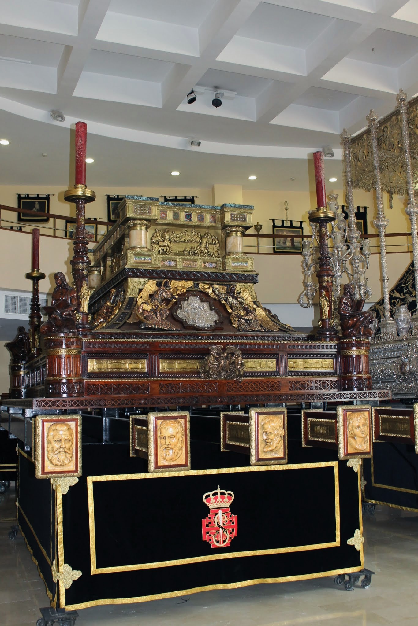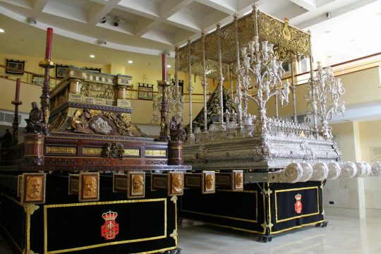 Una vez que se ha accedido al vestíbulo de la planta baja del edificio, nos encontramos a la izquierda del mismo, el salón de tronos, donde están dispuestos los majestuosos tronos tanto del Cristo, obra del padre Félix Granda, como el de la Virgen, obra de Seco Velasco.